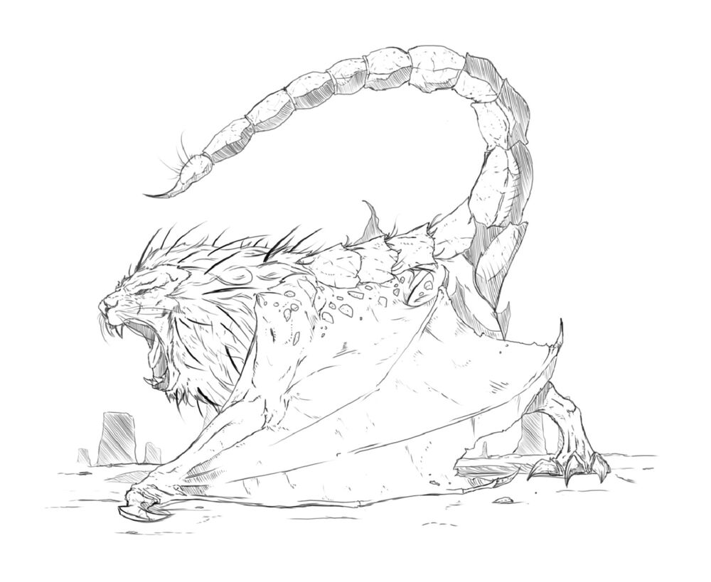 Невероятное опасное магическое существо с телом льва, головой человека и хвостом скорпиона; по некоторым описаниям имеет рыжую гриву и три ряда зубов, а также голубые глаза. Хвост мантикоры заканчивается шипами, яд которых убивает мгновенно.